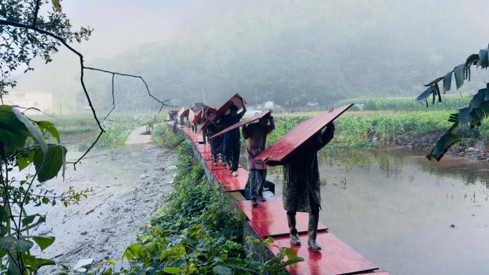 “必须马上搭起通村桥!”黄权响当机立断,第一时间协调筹集木板等应急物资。在镇党委政府的指导下,他带领40余名党员干部群众开始了与时间的赛跑,沉重的木板在湿滑的手中传递。