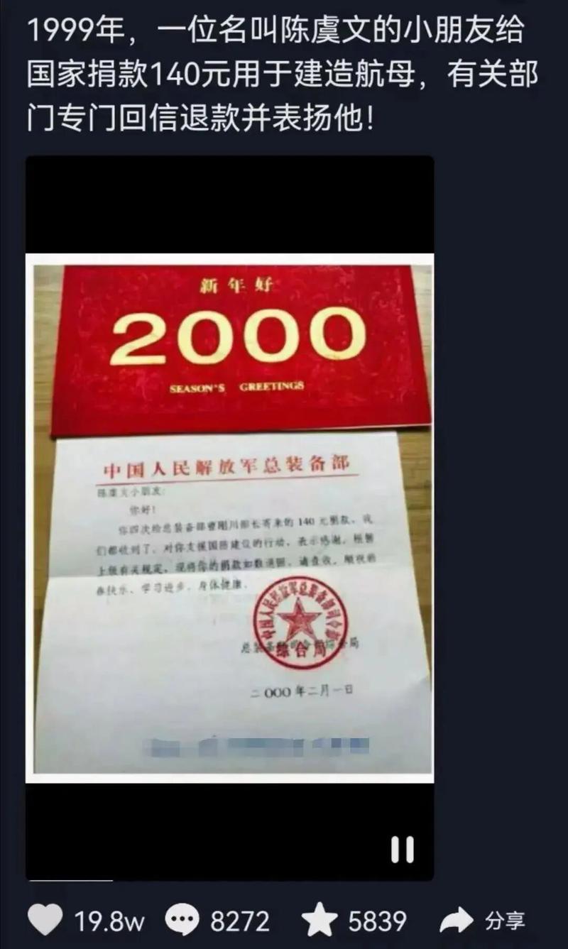 “1999年,一位名叫陈虞文的小朋友给国家捐款140元,用于建造航母,初衷很简单——‘为了祖国不被欺负’,有关部门专门回信退款并表扬他!”