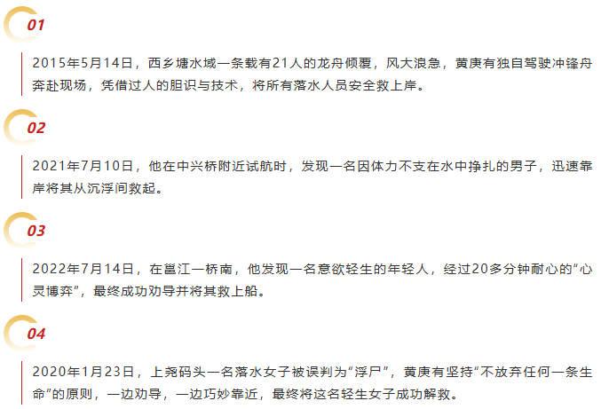 “挽救一条生命,就是挽救一个家庭。”这是黄庚有最深的工作感悟,也是他十六年如一日的行动准则。据不完全统计,从警以来,他与同事共同救起落水群众超过200人,其中仅他独自救援的就有70多人,救援履历上写满了惊心动魄……