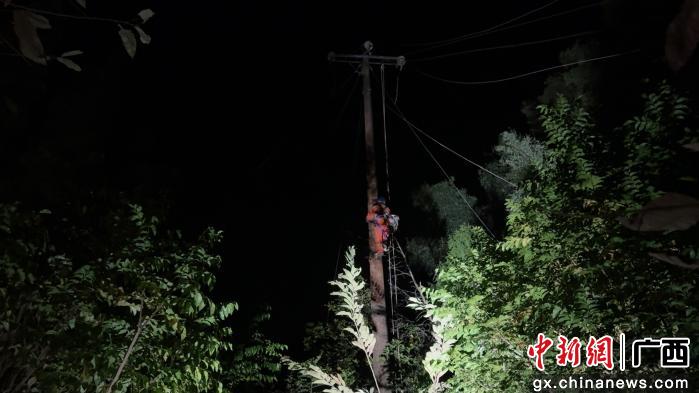 图为工作人员正在上杆作业。阳朔县融媒体中心供图