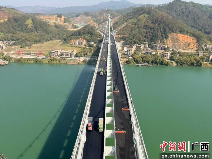 中新网广西新闻1月8日电(卢燕 杨丽娟)1月8日,随着最后一斗沥青料精准摊铺、压路机均速碾压成型,由广西交通投资集团投资建设的苍梧至容县高速公路关键工程——苍容浔江大桥右幅钢桥面沥青铺装顺利完成,标志着大桥桥面施工全面完成,为项目冲刺年度通车目标奠定坚实基础。