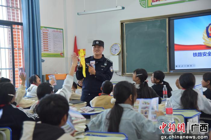 “小朋友们,如果看到铁轨上有石头,能不能去捡呀?”“如果防护网破了个洞,我们能钻进去吗?”穿着警服的南宁铁路公安局北海公安处钦州站派出所陆屋警务区民警林绍理手里举着铁路安全宣传手册,正和孩子们一问一答。