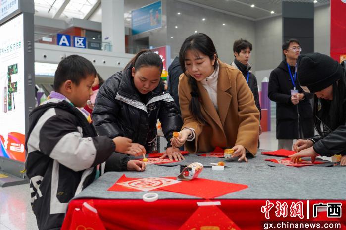 上午10时许,候车厅内的非遗体验区率先迎来旅客,猜灯谜、新年拓印画、滚印红包等趣味项目,身着民族服饰的工作人员带着旅客在动手参与中感受传统年俗魅力,现场暖意融融。