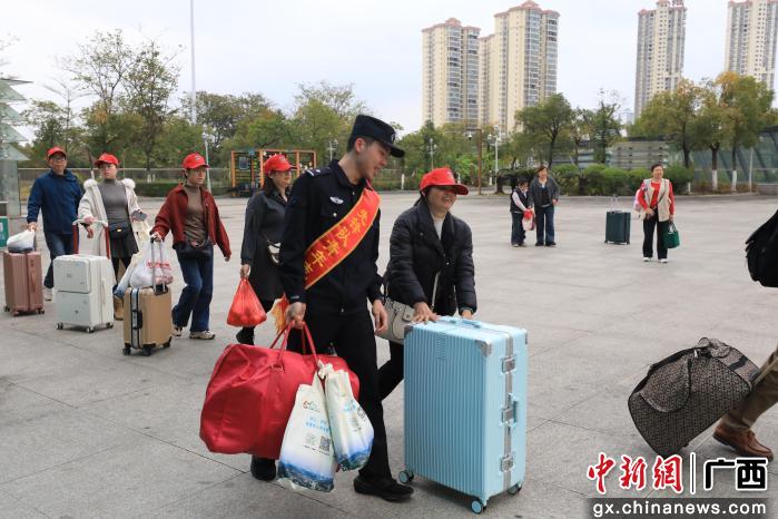 同一天,由来宾市政府、合山市就业服务中心和惠州市人力资源社会保障综合事务中心联合组织的236名赴粤务工人员也来到来宾北站,乘坐D3755次车前往广州南站。铁路公安机关也早早联合车站开辟绿色通道,在检票口、电梯口、安检口等关键岗位加强引导,安排民警帮助搬运大件行李,并在候车期间开展了反诈宣传。