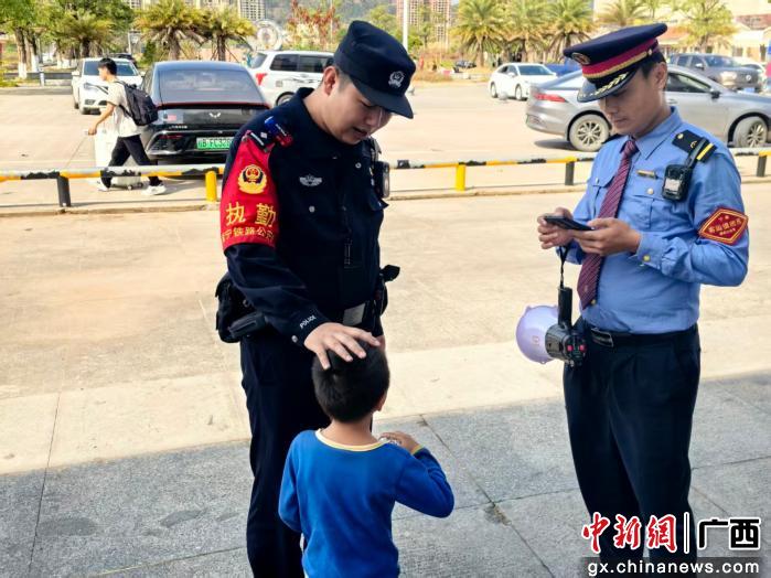 岑溪站执勤民警黄泽强一边安抚孩子情绪,一边尝试询问更多信息。男孩年幼,无法说清家人姓名和联系方式。民警判断其母亲可能尚未下车,随即联系列车长协助查找。