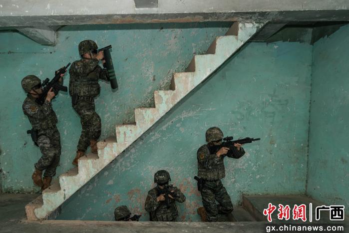 图为官兵在废弃楼内进行战术搜索。何其骏 摄