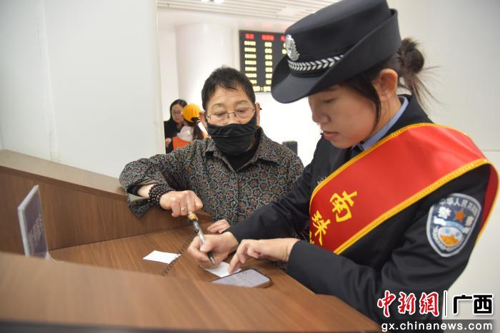 10点,售票大厅热闹起来。自助售票机前,八旬老人面对屏幕不知所措。民警潘劼迎上去,用一口流利的合浦方言轻声指导:“阿婆,睇这里,点‘老年票’,就得啦!”