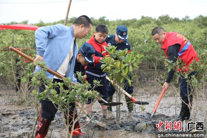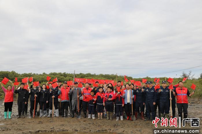 中新网广西新闻3月10日电 (宋谋春)3月10日,广西防城港市北仑河口国家级红树林自然保护区内,军地代表齐聚竹山片区,共同参与“军民共建双拥林·绿动北仑河口”植树活动。