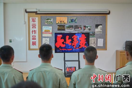 在书香军营内,官兵们集中观看电影《七七事变》,影片结束后,官兵代表走上讲台,与大家共同分享强军故事,号召官兵接续传承好先烈遗志,共同守护好祖国的大好河山。