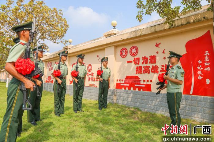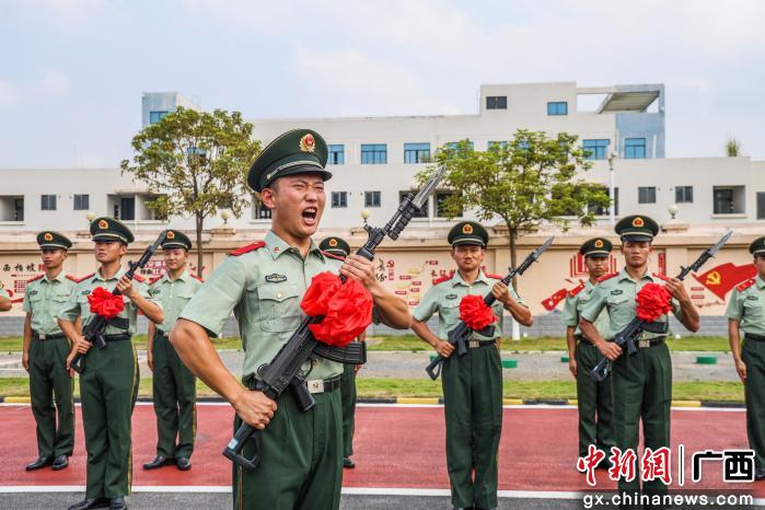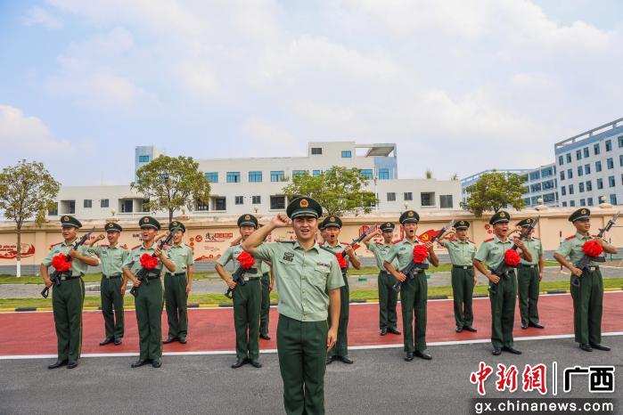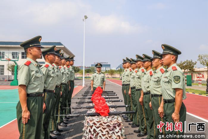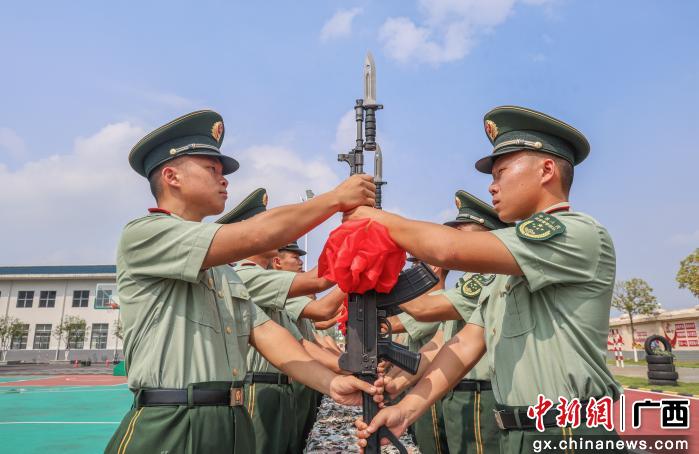 近日,武警广西总队来宾支队为新兵举行授枪仪式,以此激发新兵扎根军营、献身国防的责任感和使命感。