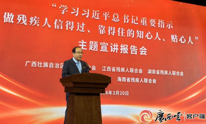 3月20日,广西、江西、湖南、广东、海南五省(区)残联在南宁举办“学习习近平总书记重要指示,做残疾人信得过、靠得住的知心人、贴心人”主题宣讲报告会,10名优秀残疾人工作者分享他们的助残经验和感人故事。