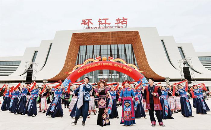 2023年8月31日,贵南高铁全线贯通,标志着广西环江毛南族自治县结束了没有高铁的历史。图为当日当地各族群众在环江站载歌载舞喜庆高铁通车。人民图片黄云/摄
