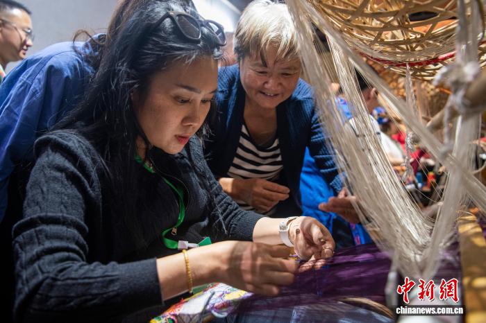 11月16日,来自泰国、柬埔寨、老挝等国家和地区的海外媒体人走进广西来宾市忻城县,体验壮锦技艺。……