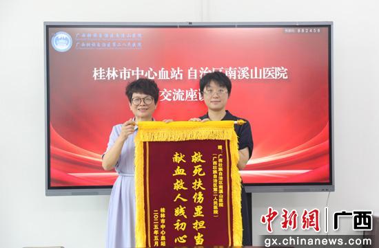 周素代表桂林市中心血站向医院郑重授予锦旗。医院供图