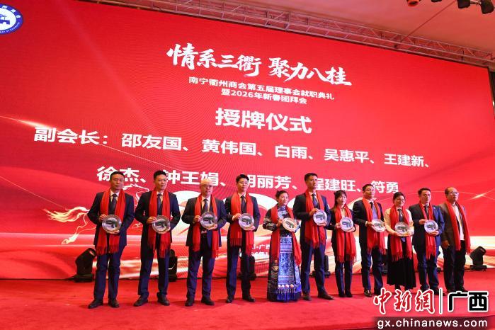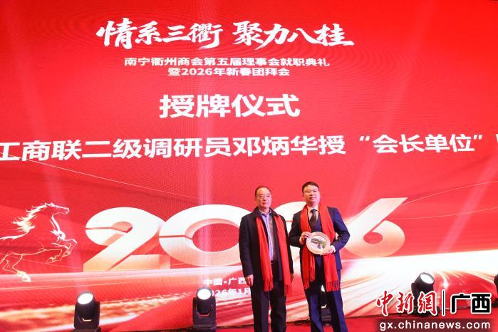 中新网广西新闻1月25日电 (林浩)1月23日,南宁衢州商会举行以“情系三衢,聚力八桂”为主题的第五届理事会就职典礼暨新春团拜会,南宁市工商联二级调研员邓炳华向郑文军授予南宁衢州商会会长牌匾,标志着第五届理事会正式履职。