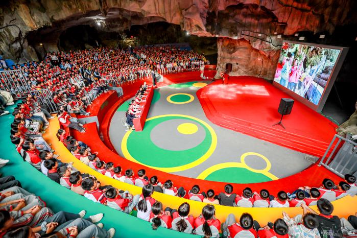 据介绍,在修建礼堂近200个日夜里,项目团队克服了雨水多等不利影响,针对原礼堂年久失修、存在安全隐患的痛点,对溶洞进行了全面的风险排查与看台专业防坠加固,并重新铺设了安全可靠的电力及排水系统,确保礼堂使用安全。在此基础上,团队对内部空间进行了现代化功能升级,包括铺设全新地面、改造升级看台座椅、安装舞台灯光与音响系统,并增设了一块大型多媒体屏幕,使其能够满足集会、演出、电影放映等多种需求。