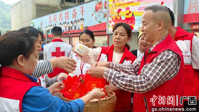 东兰县红十字志愿者为社区老人送上百家米。高东风 摄
