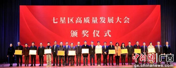 中新网广西新闻3月4日电(王亚东)3月2日,桂林市七星区举行高质量发展大会,政校企欢聚一堂,共谋奋进发展新篇。会上,桂林市七星区为50家高质量发展先进企业颁奖,为企业鼓舞信心,鼓励他们蓬勃发展,继续释放蓬勃的发展潜能与强劲动能,在新年取得新突破。