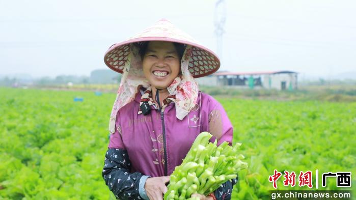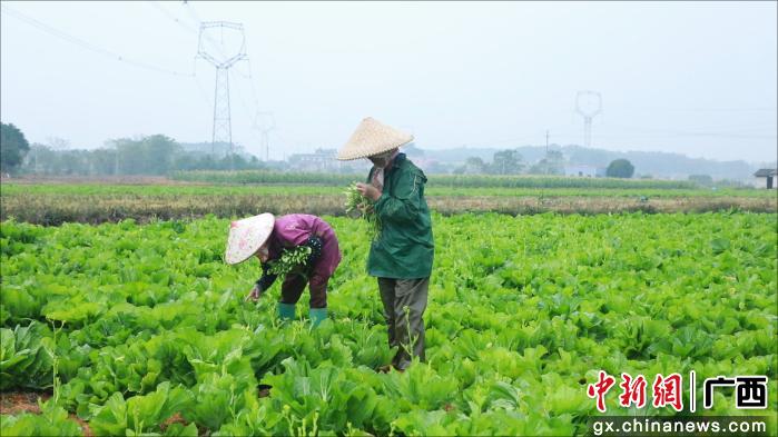 中新网广西新闻12月17日电 (刘晨 韦华权)近日,走进广西桂平市白沙镇福田村的蔬菜基地,只见连片的芥菜郁郁葱葱、长势喜人。工人们在田间地头穿梭忙碌,麻利地采摘、装筐,一派丰收的热闹景象。