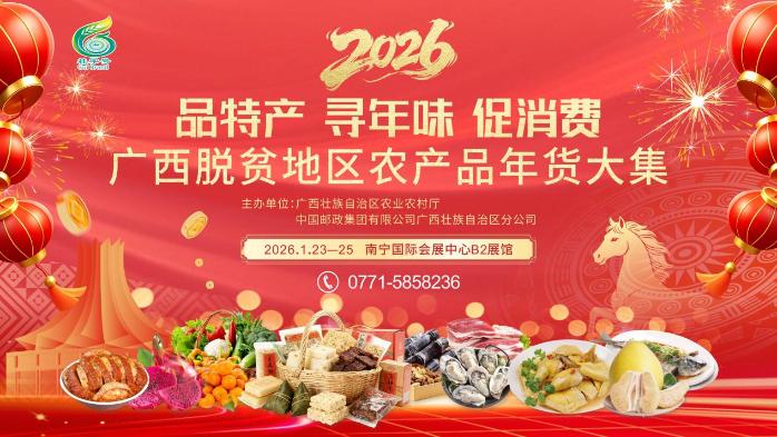为推动巩固拓展脱贫攻坚成果同乡村振兴有效衔接,丰富春节期间城乡居民的“年货篮子”,2026年广西脱贫地区农产品年货大集将于1月23日至25日在南宁国际会展中心B2展馆举行。
