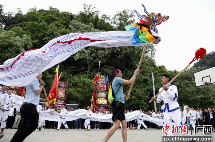 图为村民在花炮集结地舞动布龙。甘勇 摄
