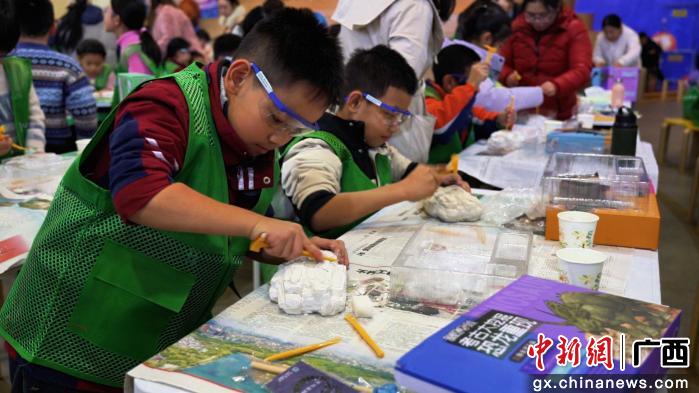 恐龙科普相关活动点燃了大小朋友的探索热情。“龙吟游园会”设置有“展厅探秘”“拼图挑战”等四大挑战,参与者在闯关过程中,全面感受到广西恐龙的独特魅力;“我和恐龙比个‘高’”分享活动中,参与者纷纷与恐龙骨架展品合影分享,记录博物馆之旅的同时传递惊喜;“恐龙探索·我是小小古生物学家”活动中,孩子们化身古生物学家,亲手挖掘、清理、辨认恐龙化石模型,沉浸式体验考古发掘的乐趣。