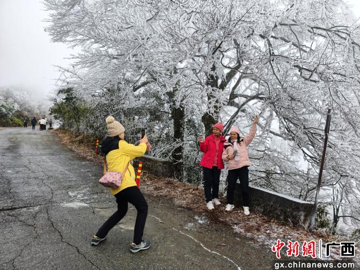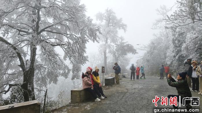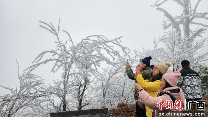 中新网广西新闻1月23日电(滕彬)受强冷空气影响,日前,广西桂林市兴安县猫儿山迎来2026年雾凇最佳观赏期,这座海拔2141.5米的华南第一峰银装素裹,玉树琼枝的绝美景致吸引游客慕名前来,邂逅南国独有的冰雪浪漫。