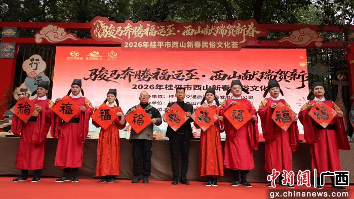 桂平西山风景区人潮如织。“新春国潮巡游”在此擂鼓启幕,身着国潮服饰的队伍沿红毯巡游,向游客派送开运红包。主舞台区域上演“迎春雅韵汇演”,古筝、琵琶等器乐演绎国风经典,更有书法大家现场挥毫泼墨,吸引众多游客驻足欣赏。同时,身着国潮服饰与玩偶服的工作人员在人群中穿梭巡游,与游客亲密互动,派发开年礼品。