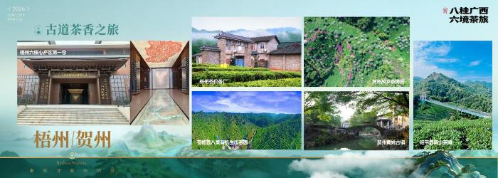 景点串联:梧州市苍梧县六堡茶核心产区第一仓→苍松茶厂→合口古码头;贺州市昭平县故乡茶博园→南山茶海→黄姚古镇
