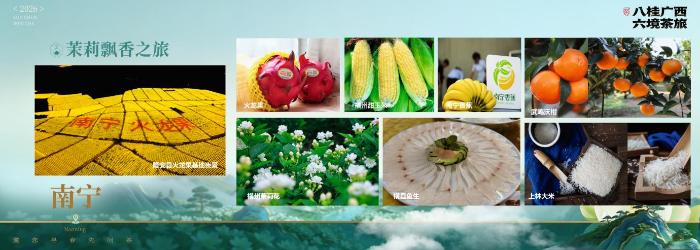 桂品好物:游玩途中,可寻味非遗美食横县鱼生,搭配本地特色酱料,感受壮乡舌尖风味。返程伴手礼,可精选横州茉莉花茶(国家地理标志保护产品)、南山白毛茶(历史名茶)等,再捎上横州大粽、横州甜玉米(地理标志保护农产品)、南宁火龙果、武鸣沃柑等,将花香、米香、果香与桂味记忆一并带回家中。