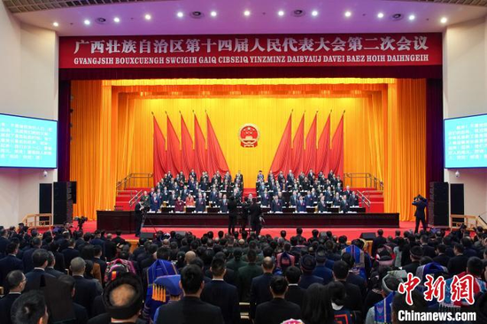 广西壮族自治区第十四届人民代表大会第二次会议当日在南宁开幕,蓝天立在会上作政府工作报告。