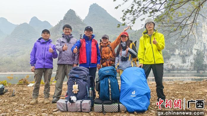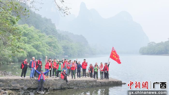 图为徒步爱好者与测评团成员在漓江边合影留念。杨宗盛 摄