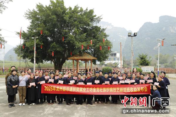 中新网广西新闻12月31日电(谢中国)12月30日,2025年龙州县非遗扶贫就业工坊金龙壮族织锦技艺研培班收益发布会在广西龙州县金龙镇双蒙村板池屯举行,近40名“居家就业”的绣娘共领到了广西织绣发展研究会派发的13万元收益金,屯里洋溢着丰收的景象,现场还吸引了不少网红主播在现场进行带货直播。