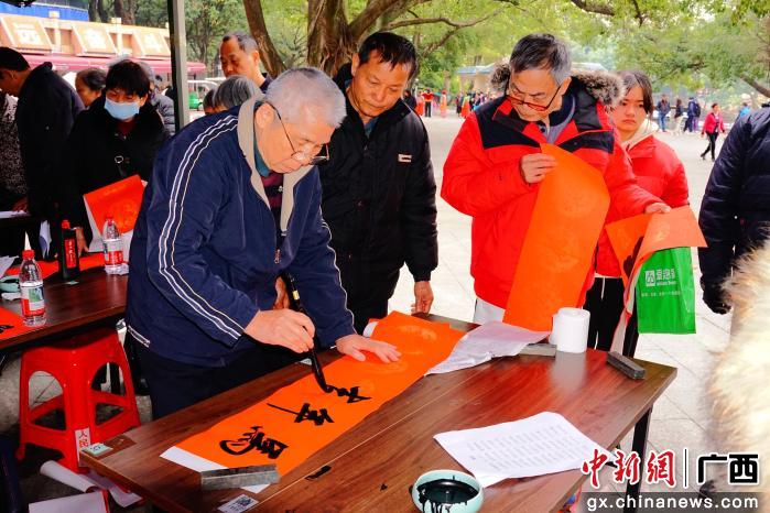 中新网广西新闻1月25日电 (冯兆强)1月24日,由广西中华文化促进会主办,广西中华文化促进会楹联专业委员会和南宁市人民公园承办的“2026年写春联送福字文化惠民活动”,在南宁市人民公园榕荫广场举行。