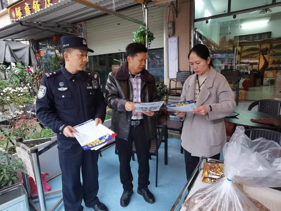 “阿叔阿婶,春节快到了,骗子也在冲‘业绩’,凡是提到钱、要转账的,多留个心眼!”友谊关边境派出所副所长覃红森用本地话大声叮嘱,将反诈宣传单递到老年居民手中。旁边,周梅初则用越南语夹杂着本地话,正向几位越南籍商户解释中国出入境管理法规。