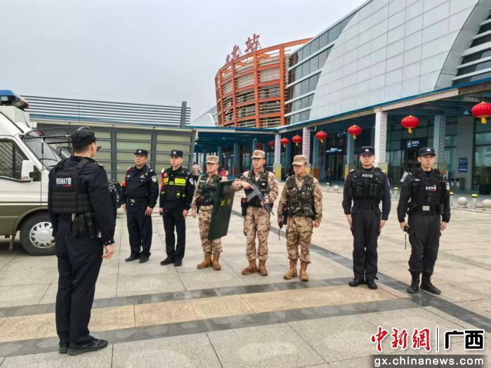 中新网广西新闻2月24日电 (武涛)2026年春运启动以来,柳州铁路公安处来宾北站派出所紧扣管内春运安保工作实际,坚持提前谋划、主动发力,联合地方武警、特警打出安保“组合拳”,全面强化站区治安防控工作。