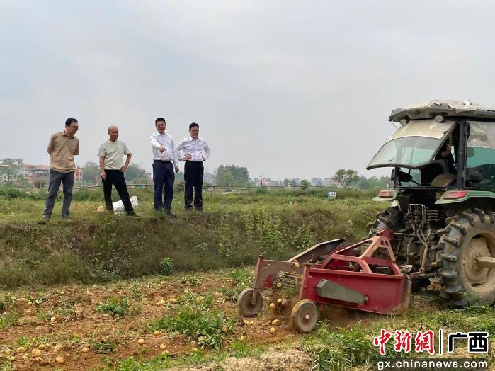 在苍梧县沙头镇马铃薯种植基地,马铃薯收获机在田垄间穿梭作业。相较于传统人工作业,机械化采收效率提升十多倍,同时有效降低薯块破损率,切实保障了马铃薯的品质与产量。