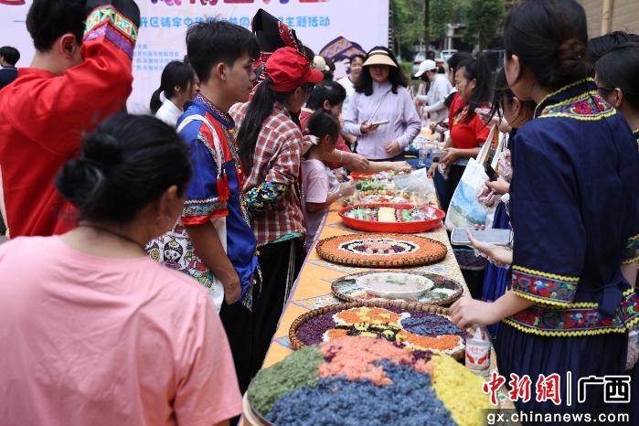 民族体育体验区加油声此起彼伏。三人板鞋接力中,居民们齐心协力、默契前行;抛绣球环节,抛球者屏息凝神,背篓者灵活移动,绣球划出优美弧线入篓,赢得阵阵喝彩。投壶区排起长队,参与者手持箭羽,感受古人雅趣。非遗展示区内,壮锦挂件、扎染、绣球等物件吸引众多居民驻足欣赏。有奖问答环节围绕民族文化、民族团结政策展开,大家争相抢答。